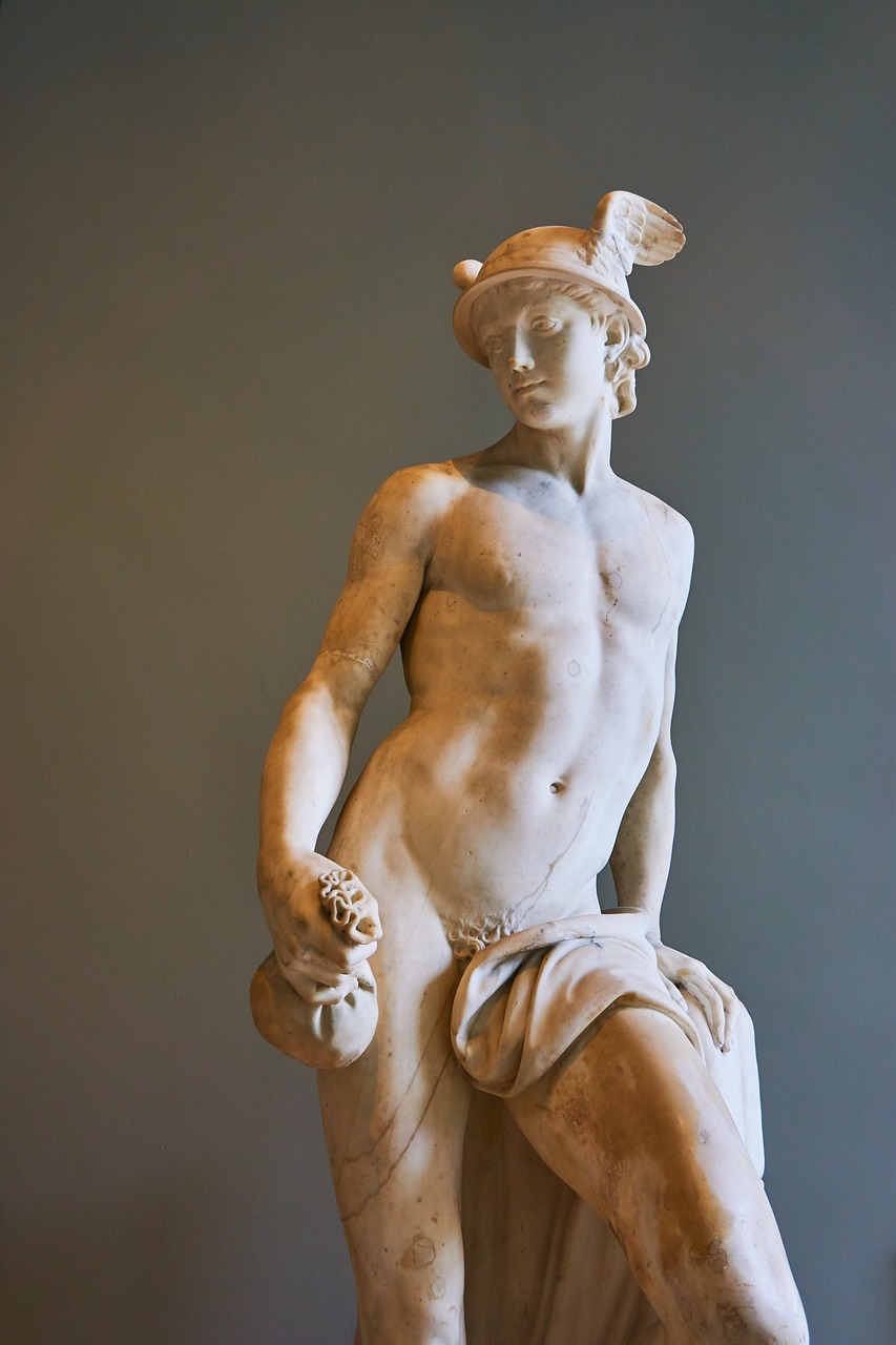 Ermes (in latino Mercurio), figlio di Zeus e della ninfa Maia, è il dio greco del commercio, dei viaggiatori, dei ladri, nonché messaggero degli dèi. Grazie alla sua grande velocità, Ermes è conosciuto per la sua capacità di spostarsi rapidamente tra il mondo degli dèi e quello degli uomini, svolgendo il ruolo di intermediario e messaggero divino.
