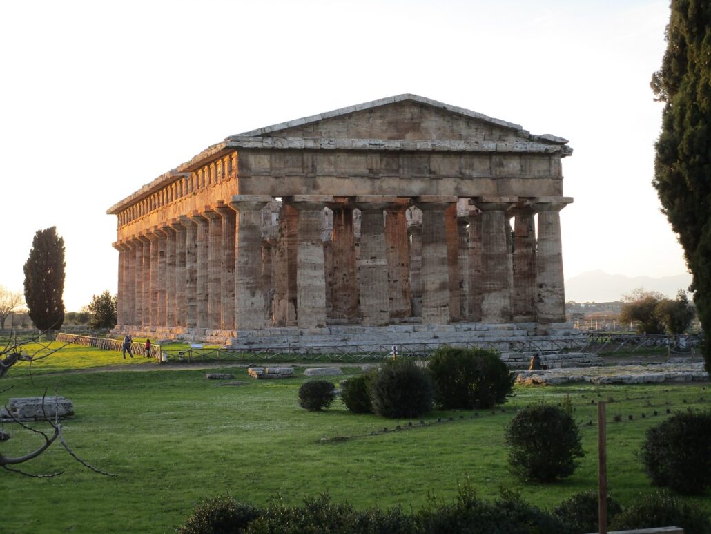 - Paestum, originariamente chiamata Poseidonia, fu fondata dai coloni greci della città di Sybaris nel VI secolo a.C. La città fu in seguito rinominata da coloni romani quando la regione fu incorporata nell’Impero Romano.