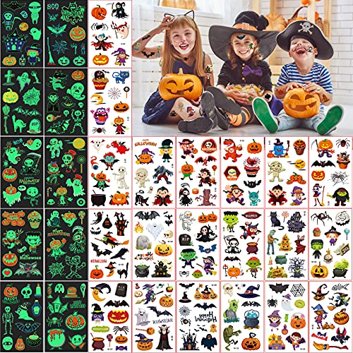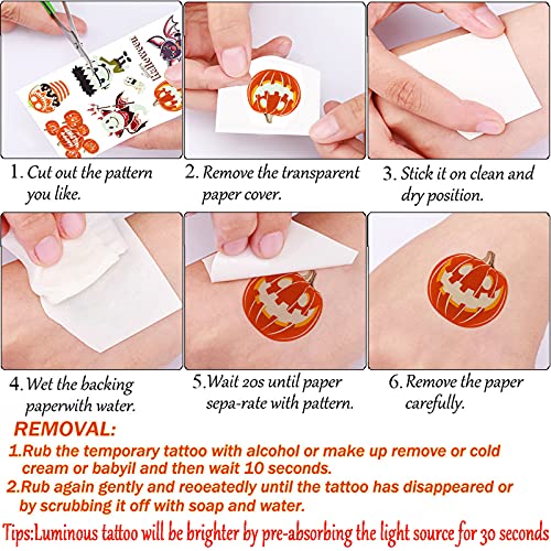 - 【Una varietà di stili】20 fogli di tatuaggi temporanei per cartoni animati di Halloween, colori vivaci e duraturi rendono i bambini più divertenti per tutte le età, compresi bambini e adulti. 10 fogli di tatuaggi temporanei luminosi che aggiungono mistero e riflessi alla notte di Halloween, l’adesivo luminoso assorbe la fonte di luce per 30 secondi in anticipo e diventa più luminoso al buio.