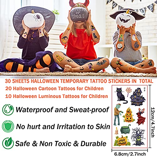 - 【Tatuaggio di Halloween per bambini】30 fogli di tatuaggi per regali per ragazzi e ragazze e accessori per feste tatuaggi temporanei Halloween. Gli elementi di Halloween più popolari di bambini, zucche, pipistrelli, fantasmi, teschi, zombi, mummie, mietitrici, streghe, ragni ecc. A varietà di design, lascia che i bambini trascorrano un felice Halloween.