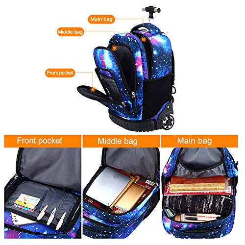 - Grande capacità: questo zaino per ragazzi con ruote ha più tasche per classificare gli oggetti per bambini, può contenere libri, cancelleria, file A4, laptop, iPad, vestiti, bicchieri d’acqua, ecc.