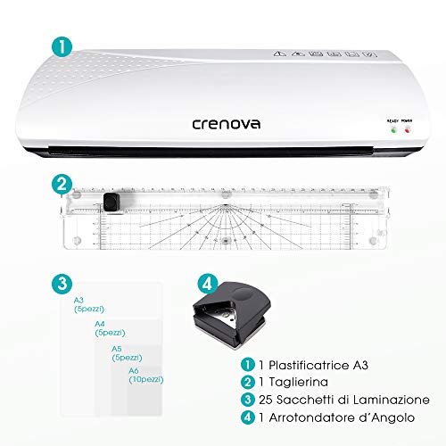 - Kit Starter con Serie Completa Classica: Include la plastificatrice, taglierina, arrotondatore d’angolo, e 25 sacchetti di laminazione (10 A6/5 A5/5 A4/5 A3) per risparmiare tempo e denaro