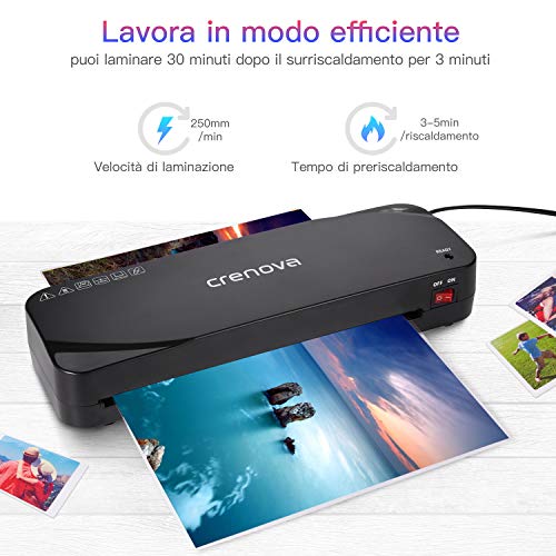 - Riscaldamento Veloce, Produzione Elevata: L’impressionante tempo di riscaldamento di 3-5 minuti e la notevole velocità di laminazione di 250 mm al minuto consentono una produzione efficacie ed efficiente. Lamina fino a 50 fogli all’ora ed è compatibile con 2 sacchetti da 60/80/100mic.