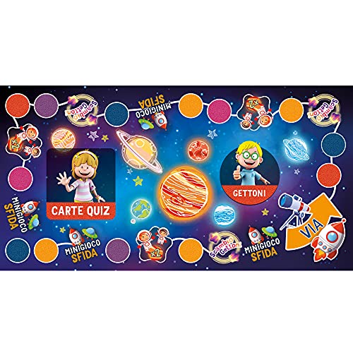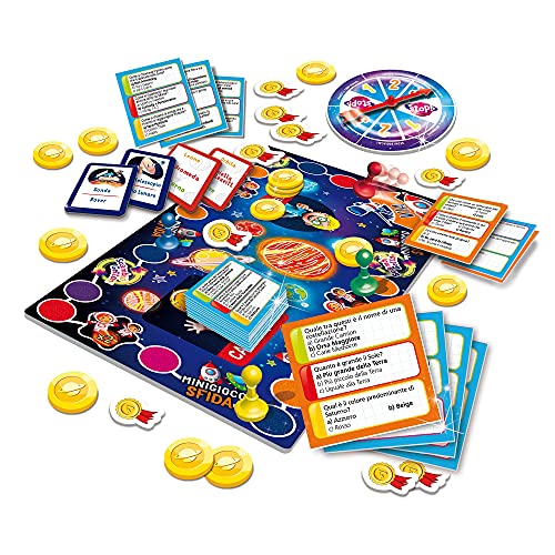 - Contenuto: Tabellone, birilli, spinner, carte quiz, gettoni, coccarde, carte speciali, regolamento