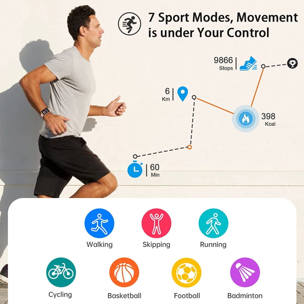 - Il movimento è sotto il tuo controllo: lo orologio Popglory ha 8 modalità sportive (camminata, corsa, ciclismo, salto, badminton, pallacanestro, calcio), che mantengono il tuo allenatore più scientifico. E può tenere traccia dei dati di attività quotidiane come passi, calorie, distanza e minuti attivi e generare dati.