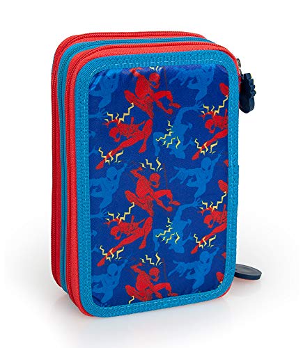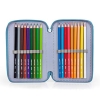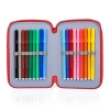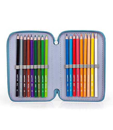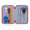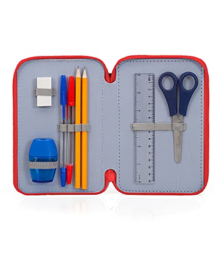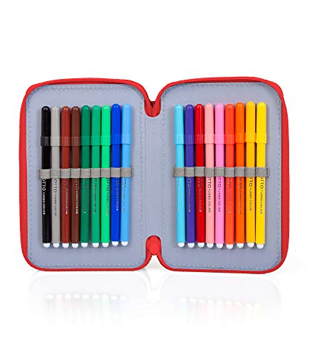 - Contenuto astuccio: triplo scomparto, 1 penna a sfera blu, 1 penna a sfera rossa, 2 matite, 1 gomma, 1 temperino, 1 righello, 1 forbice, 18 pastelli Carioca, 18 pennarelli Giotto.