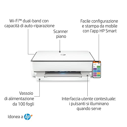 • Stampa in fronte/retro automatico, Wi-Fi Dual Band, Wi-Fi Direct, HP Smart App, AirPrint, USB 2.0, Formato A4, Fax, No ADF, No Ethernet, Cavo USB non è incluso