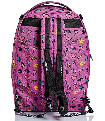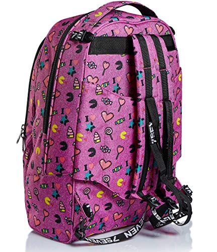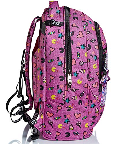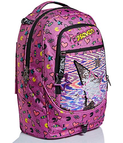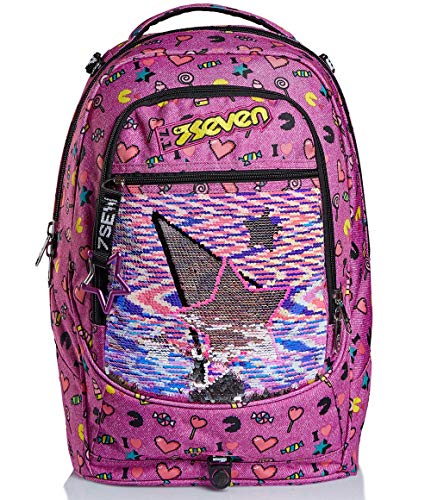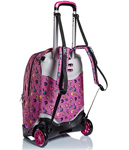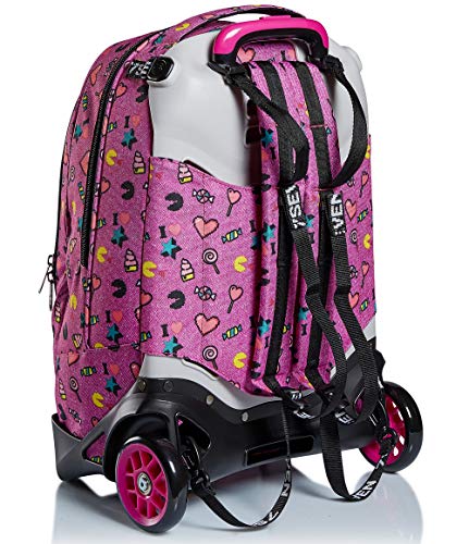 - ALTRE CARATTERISTICHE: Maxi ruote da 10 cm. Spallacci a scomparsa totale nello schienale quando utilizzato come trolley. Fondo rinforzato e protezioni angolari. Applicazione con paillettes reversibili. Logo ricamato e puller in nastro con moschettone amovibile.