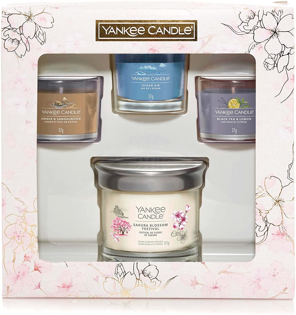 - Questa confezione regalo contiene 3 candele votive profumate e 1 candela Tumbler Signature piccola nelle fragranze Amber & Sandalwood, Black Tea & Lemon, Ocean Air e Sakura Blossom Festival